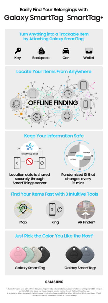 Galaxy SmartTag+ is progressively available from April 16.1 Galaxy SmartTag+ operates using the SmartThings Find service, provided in the SmartThings app. To find out more, visit www.samsung.com/smartthings.
